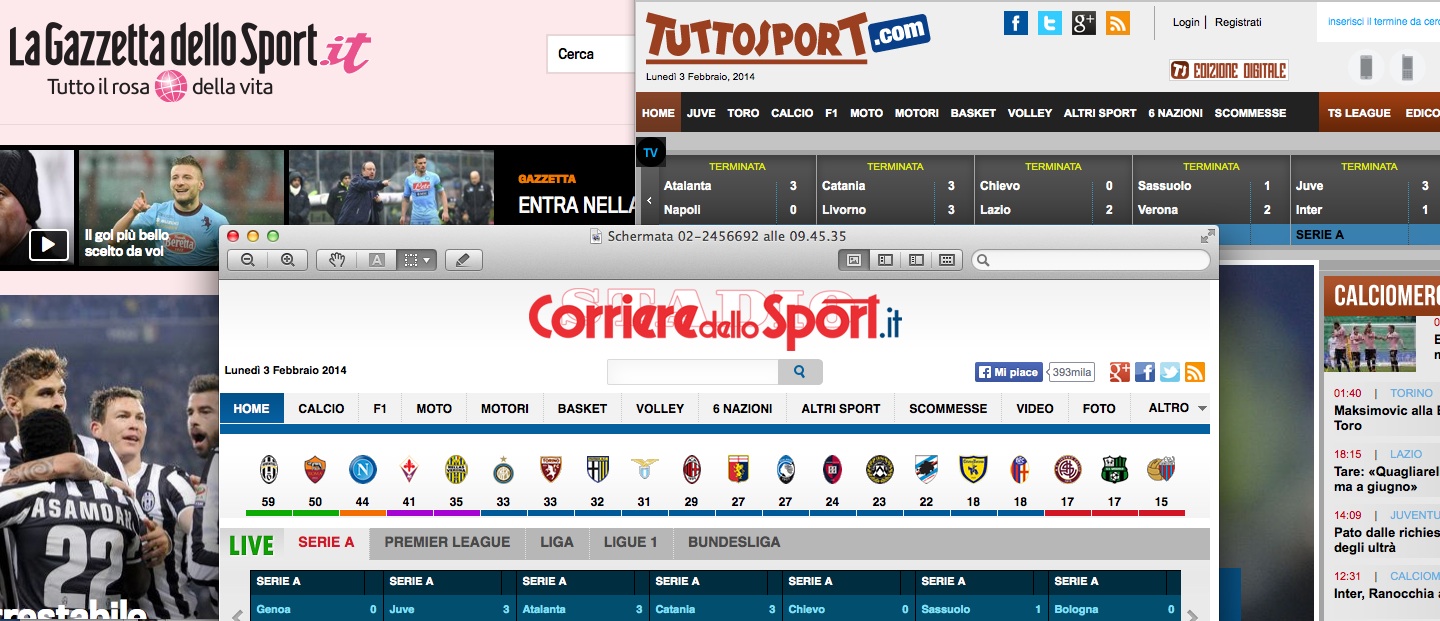 Non lo dico io, lo testimoniano le cifre. Nel periodo dicembre 2012/dicembre 2013 (fonte Audiweb) il flop è notevole: -6.37% Gazzetta, -20.1 Corriere, -12.1 Tuttosport. E in questo caso non regge neppure l’argomento “è colpa della crisi”, perché l’informazione sportiva online in Italia è totalmente gratuita.