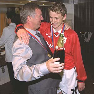 Ferguson (nella foto sopra festeggia con Solskjaer) gli dice di prepararsi a entrare, sostituirà Andy Cole.