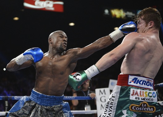 La boxe di Mayweather non annoia, esalta tutti quelli che sanno di pugilato. La sua difesa andrebbe studiata, analizzata, capita. La velocità di braccia, la rapidità degli spostamenti, la reattività dei piedi, le intuizioni in fase di attacco (nella foto, il jab sinistro di Floyd a segno contro Alvarez), la scelta di tempo. Solo chi pensa che l’unico elemento di spettacolarità della boxe sia il ko o la battaglia feroce può negare l’abilità assoluta del campione. Certo, è un modo di stare sul ring assai difficile da insegnare. Difficile anche perché dovresti trovare l’elemento che abbia le caratteristiche psicofisiche per assorbire simili insegnamenti. E poi perché si dovrebbe osare.