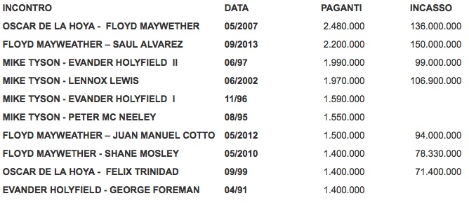 L’incasso della pay per view è stato di 150 milioni di dollari (fonte Forbes), battuto il record che apparteneva a Mayweather (foto sopra)-De La Hoya (del 2007). Le connessioni sono state 2,5 milioni, superati i i 2,48 milioni del precedente primato. Ecco la top ten della pay per view prima di Mayweather-Alvarez.