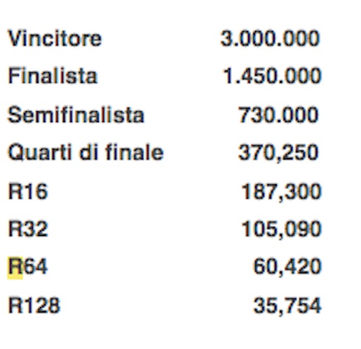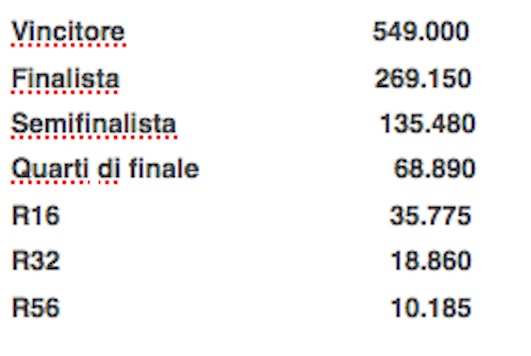 Tanto per dare un’idea di quanto guadagnino attualmente i migliori tennisti (quelli che beneficerebbero più degli altri dei potenziali aumenti), riporto i premi (in euro) degli ultimi Internazionali d’Italia giocati a Roma.
