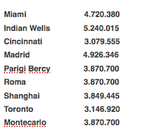 Ecco la lista dei nove Master a rischio raddoppio e l’attuale montepremi in dollari.