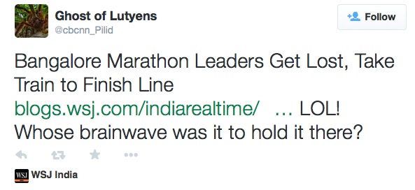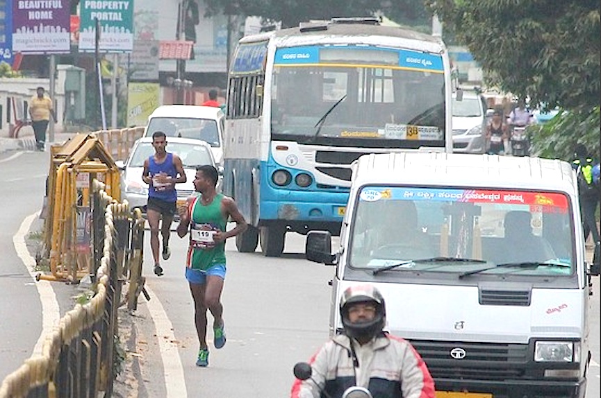 Ci sono sei auto della polizia lungo il tracciato che è delimitato da alcune strisce di plastica e qualche sbarra di legno con cui si dovrebbero tenere a bada gli automobilisti. Gli abitanti di Bangalore sono nove milioni e parte di loro non è disposta a rimanere in fila anche di domenica mattina solo perché c’è una maratona in città. Così perdono la pazienza più velocemente di quanto non corrano i maratoneti e invadono il percorso.