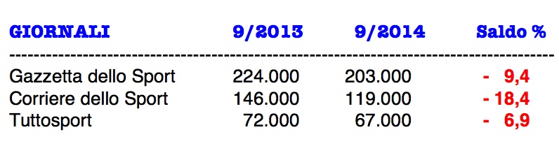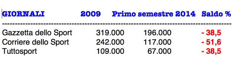 La tendenza è in forte perdita per i tre giornali di settore. La Gazzetta dello Sport è comunque riuscita a contenere in molti mesi dell’anno il calo in numeri a una cifra, mentre il Corriere dello Sport si è ormai stabilizzato su perdite medie a doppia cifra.