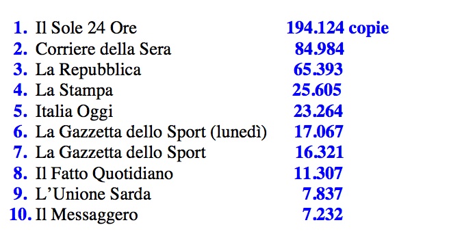 Bene il Sole 24 Ore con una media annuale 2013 di 149.000 copie, reggono Corriere della Sera (99.000) e Repubblica (62.000). Poi c’è davvero poco.