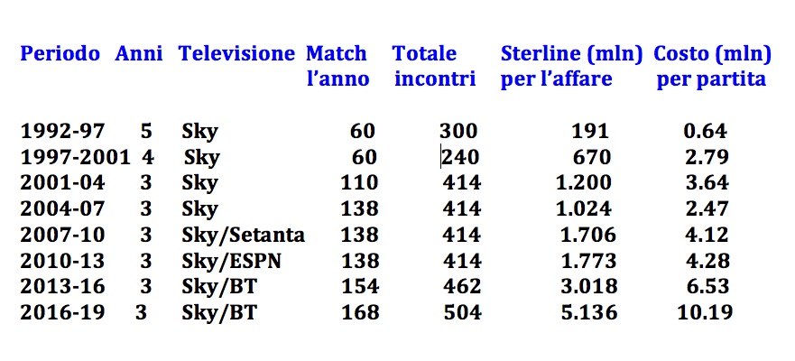 In totale nel prossimo triennio (2016-19) finiranno nelle casse della Premier League 5.136 milioni di sterline (7.344 milioni di euro!). Il che significa che ogni partita sarà pagata 10,2 milioni di sterline (una sterlina vale oggi al cambio 1,43 euro) con un incremento rispetto all’ultimo accordo del 70%.