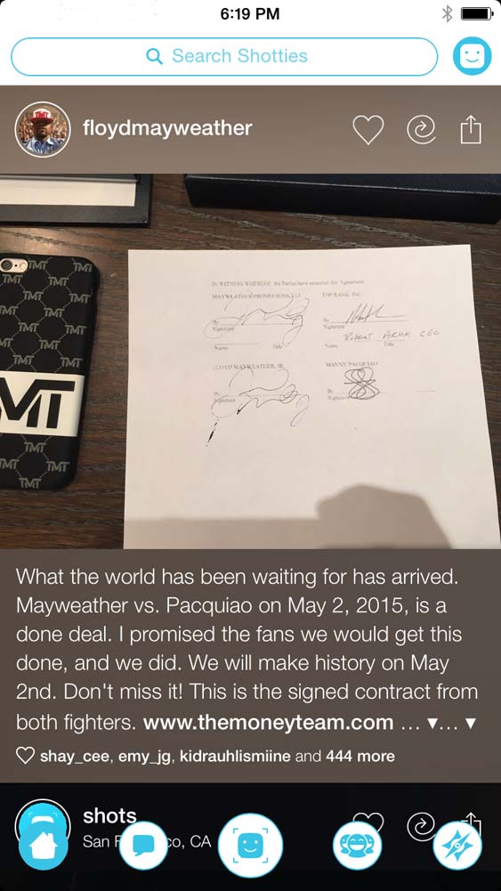 Pretty Boy ha chiesto è ottenuto di essere lui a dare l’annuncio. L’ha fatto attraverso un’applicazione social media. Si chiama Shots e non è un caso che lui sia tra gli azionisti.
