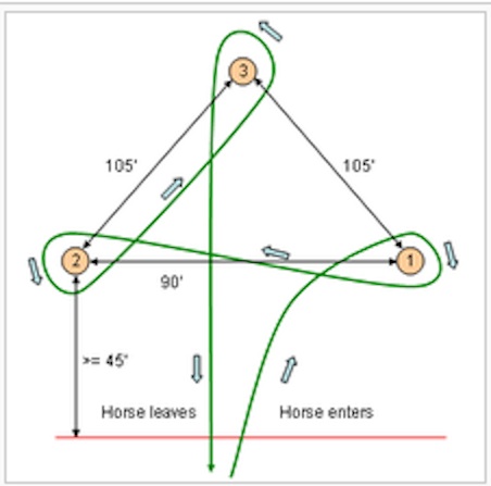 La gara in cui è stata impegnata si chiama Barrel Race, una prova in cui si deve lanciare il cavallo a tutta velocità girando attorno a tre bidoni secondo lo schema riportato sopra. Destrezza, capacità di controllo del cavallo, coraggio. Chayni a nove anni ha dimostrato di possedere tutte queste qualità. E il pubblico di Dallas ne ha fatto la sua favorita.