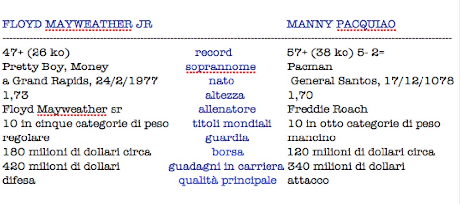Pacquiao ha 36 anni, Mayweather 38. Hanno già dato il loro meglio. La sfida avrebbe avuto un altro sapore, un’altra valenza se si fosse disputata nel 2010 o giù di lì. Ma resta comunque una delle cose più interessanti ed eccitanti da vedere in questi giorni.
