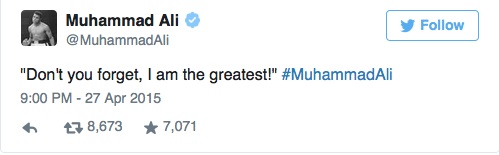 È stato postato un tweet di Muhammd Ali in risposta a Floyd Mayweather jr che aveva detto di essere il più grande di sempre. Simpatico, anche se viene dal suo clan e non direttamente dal campione.
