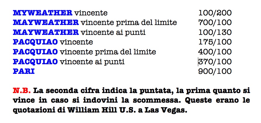 La puntata è stata fatta presso una delle agenzie William Hill U.S. a Las Vegas. Un ignoto scommettitore ha messo 100.000 (centomila) dollari sul pari tra Floyd Mayweather jr e Manny Pacquiao in cartellone il 2 maggio all’MGM Grand Arena.