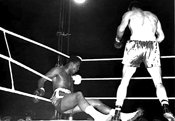Il gancio sinistro di Cooper (ricordate? ‘Enery ‘Ammer) si schianta sulla mascella destra di Cassius che vola all’indietro. Un colpo di fortuna e un lampo di geniale astuzia lo aiuteranno a venire fuori dal dramma.