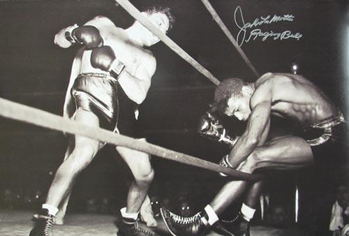 Jake La Motta (nella foto sopra la fase di un match col grande Sugar Ray, nella foto in alto manda fuori dalle corde del ring Robinson) continuava ad omaggiarlo.