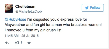 “Sono disgustata dalla tua passione per Mayweather, una ragazza che è fan di un uomo che brutalizza le donne! Ti cancello dalla mia lista di preferite“.