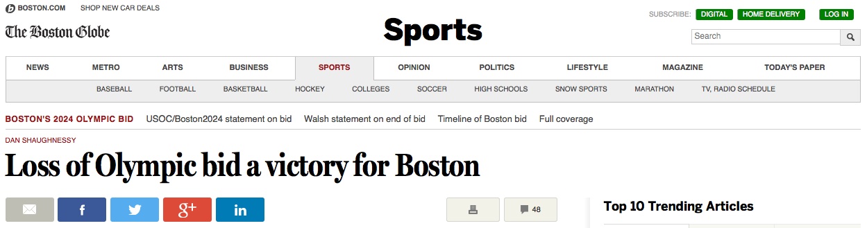 Boston Globe. “La rinuncia alla candidatura olimpica una vittoria per Boston”.