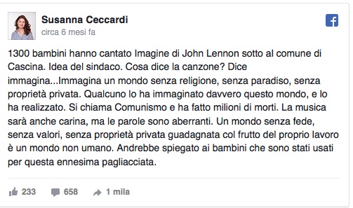 Questo il testo del post: “1300 bambini hanno cantato Imagine di John Lennon sotto al comune di Cascina, idea del sindaco. Cosa dice la canzone? Dice immagina…Immagina un mondo senza religione, senza paradiso, senza proprietà privata. Qualcuno lo ha immaginato davvero questo mondo, e lo ha realizzato. Si chiama Comunismo e ha fatto milioni di morti. La musica sarà anche carina, ma le parole sono aberranti. Un mondo senza fede, senza valori, senza proprietà privata guadagnata col frutto del proprio lavoro è un mondo non umano. Andrebbe spiegato ai bambini che sono stati usati per questa ennesima pagliacciata“.
