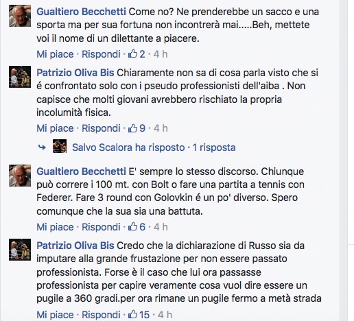 Patrizio Oliva: “Chiaramente non sa di cosa parla, visto che si è confrontato solo con gli pseudo professionisti dell’Aiba. Non capisce che molti giovani avrebbero rischiato la propria incolumità fisica”.