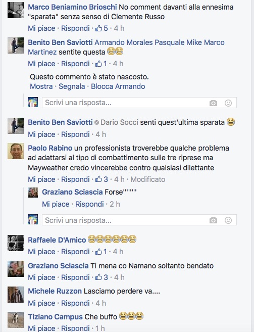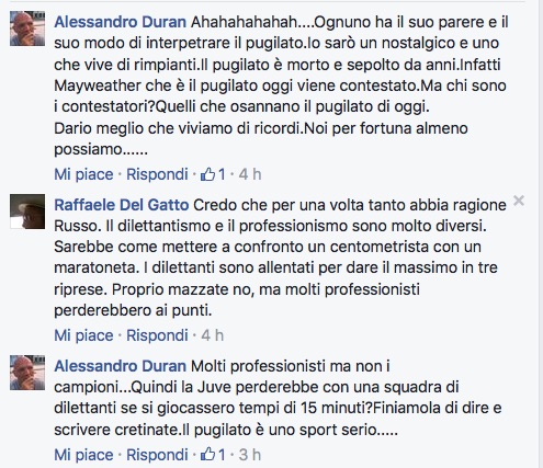 Alessandro Duran: “Ahahahahahah… Ognuno ha il suo parere e il suo modo di interpretare il pugilato. Io sarò un nostalgico e uno che vive di rimpianti. Il pugilato è morto e sepolto da anni. Infatti Mayweather che è il pugilato oggi viene contestato. Ma chi sono i contestarori? Quelli che osannano il pugilato di oggi. Dario, meglio che viviamo di ricordi. Noi per fortuna almeno possiamo”.