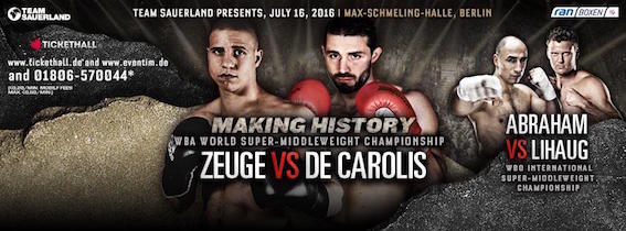 Boxe In Progress ha ceduto a Fox Sports (canale 204 del bouquet Sky) i diritti televisivi del mondiale supermedi Wba tra il detentore Giovanni De Carolis (24-6, 12 ko) e lo sfidante Tyron Zeuge (18-0, 10 ko).