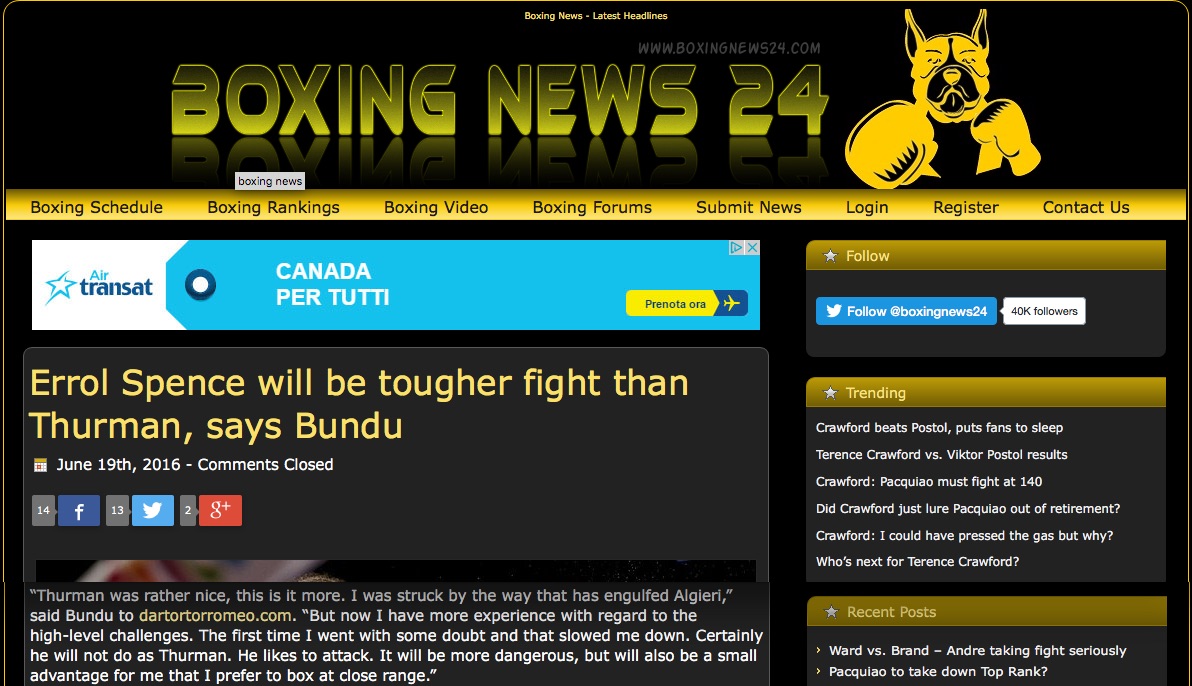 “Thurman era bello tosto, questo lo è di più. Mi ha colpito il modo in cui ha travolto Algieri. Ma adesso ho più esperienza per quel che riguarda le sfide ad alto livello. La prima volta sono andato con qualche dubbio e questo mi ha frenato. Stavolta voglio giocarmela. Senza illusioni, ma voglio giocarmela”.