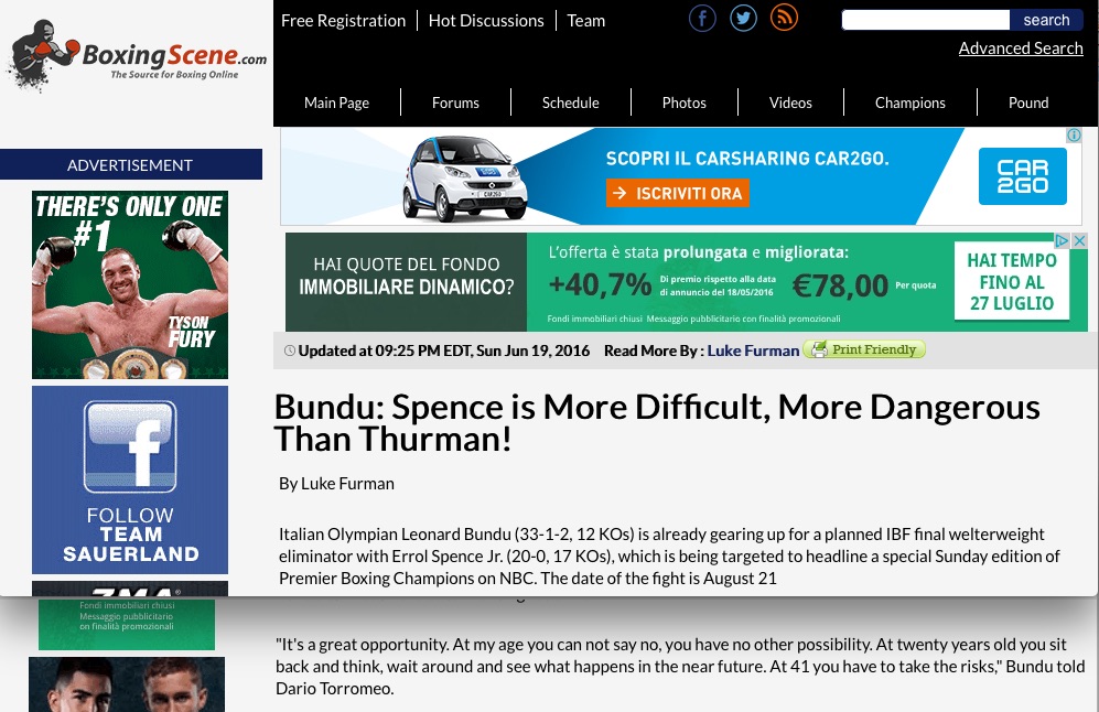 Poco più di un mese fa, dando l’annuncio della sfida tra Errol Spence jr e Leonard Bundu, ho pubblicato un’intervista al forte e simpatico pugile di casa nostra. Ora che abbiamo la certezza di vederlo in diretta e in chiaro anche da noi (Sportitalia, canale 60 digitale terrestre e 225 del bouquet di Sky nella notte tra domenica 21 e lunedì 22 agosto) ripropongo quell’articolo.