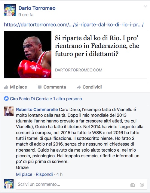 “Caro Dario, l’esempio fatto di Vianello é molto lontano dalla realtà. Dopo il mio mondiale del 2013 (durante l’anno hanno provato a far crescere altri atleti, tra cui Vianello), Guido ha fatto il titolare. Nel 2014 ha vinto l’argento alla comunità europea, nel 2015 ha fatto le WSB e nel 2016 ha fatto tutti i tornei di qualificazione. Il sottoscritto niente. Ho fatto 2 match di addio nel 2016, senza che nessuno mi chiedesse di ripensarci. Guido ha avuto da me solo aiuto tecnico e, nel mio piccolo, psicologico. Hai toppato esempio, rifletti e informati un po’ di più prima di scrivere.