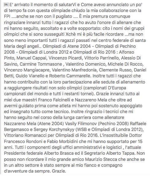 Francesco Damiani sabato non era all’angolo di Guido Vianello a Rio per l’esordio del supermassimo ai Giochi Olimpici. È stato da quel momento che si sono rincorse varie voci che annunciavano il rientro anticipato del dt azzurro in Italia. Ieri è arrivata la conferma direttamente dallo stesso Damiani. Da questo momento non lavorerà più per la Federazione, ma questo non vuol dire che lascerà il pugilato. L’annuncio è stato fatto con un post su Facebook.