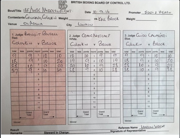 Due giudici del match tra Gennady Golovkin e Kelly Brook avevano parità (38-38) sui loro cartellini, il terzo aveva Brook in vantaggio di due punti (39-37) assegnando tre riprese su quattro al pugile di casa. E poi ce la prendiamo con i giudici dell’Aiba…