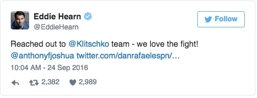 “Da parte nostra se a Wladimir Klitschko e Anthony Joshua sarà consentito di boxare per i mondiali Wba e Ibf, saremo felici di combattere” ha commentato Eddie Hearn per Joshua.