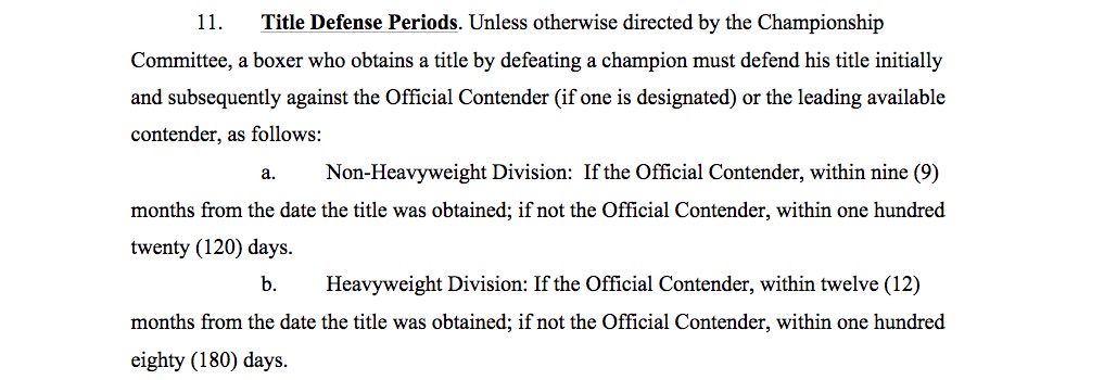 Tyson Fury ha conquistato il titolo il 28 novembre 2015 e non l’ha mai difeso. L’articolo 11 comma b del regolamento della World Boxing Association recita: “Il pugile che conquista il titolo battendo il campione in carica deve difenderlo contro lo sfidante ufficiale o contro il primo rivale di classifica disponibile entro (per i pesi massimi) dodici mesi se si tratta dello sfidante ufficiale, sei mesi se si tratta di altro pugile”.