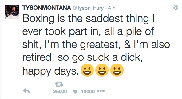 “Il pugilato è la cosa più triste a cui abbia preso parte, è tutto un mucchio di merda, Io sono il più grande e mi sono anche ritirato, andate a succhiare il pisello.”