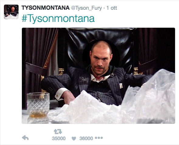 Antonio Raimondo Montana, detto Tony, è il protagonista del film Scarface (del 1983) diretto da Brian De Palma e interpretato da Al Pacino. Il protagonista è un gangster consumatore abituale di cocaina. E Tyson Fury per chiarire ulteriormente la questione ha messo su un fotomontaggio in cui lo si vede davanti a un’enorme quantità di coca.
