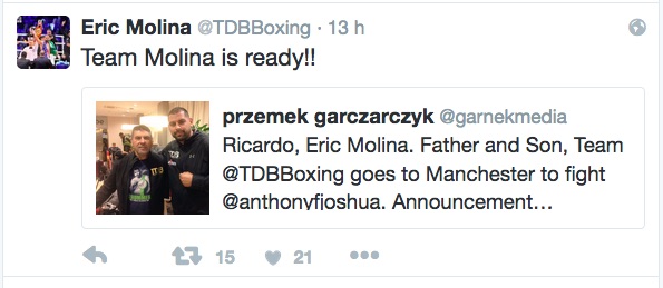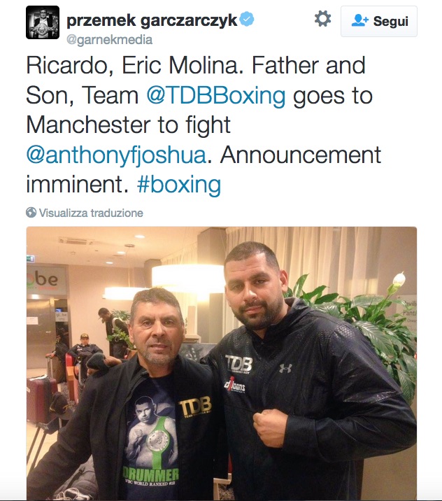 Il giornalista Przemek Garczarczyk lo ha annunciato sul suo profilo Twitter, Eric Molina l’ha fatto suo. Notizia e foto. La prima dice che sarà proprio il peso massimo texano a sfidare Anthony Joshua il 10 dicembre. La seconda offre l’immagine di Eric assieme al papà Ricardo in un aeroporto texano questa mattina. Sono attesi a Manchester nelle prime ore di stasera, pronti per la conferenza stampa in cui Eddie Hearn di Matchroom annuncerà la sfida.