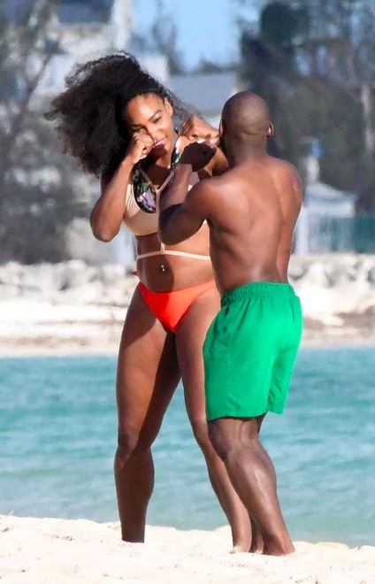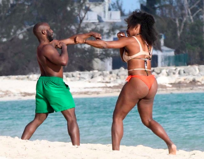 Serena Williams gioca a tirare di boxe sulla spiaggia di Nassau alle Bahamas. Le foto