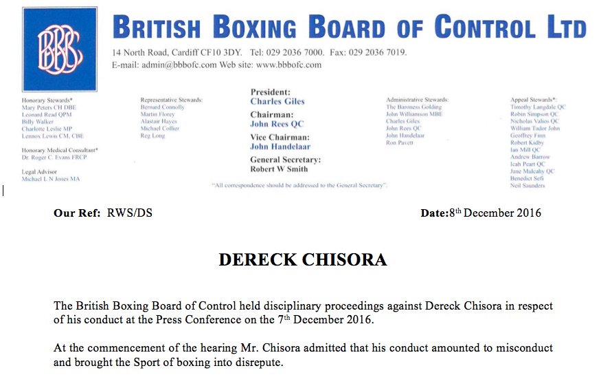 Il Consiglio ha esaminato la questione con grande attenzione e preoccupazione. Sono stati analizzati i precedenti di Chisora, che non sono di certo buoni. È stata anche presa in considerazione una lettera scritta a lui, al suo avversario Dillian Whyte, al suo manager e agli organizzatori dal Segretario Generale del BBBC il 16 novembre 2016. Nella lettera si chiedeva ai destinatari di non comportarsi male, di non portare discredito alla boxe prima del match.
