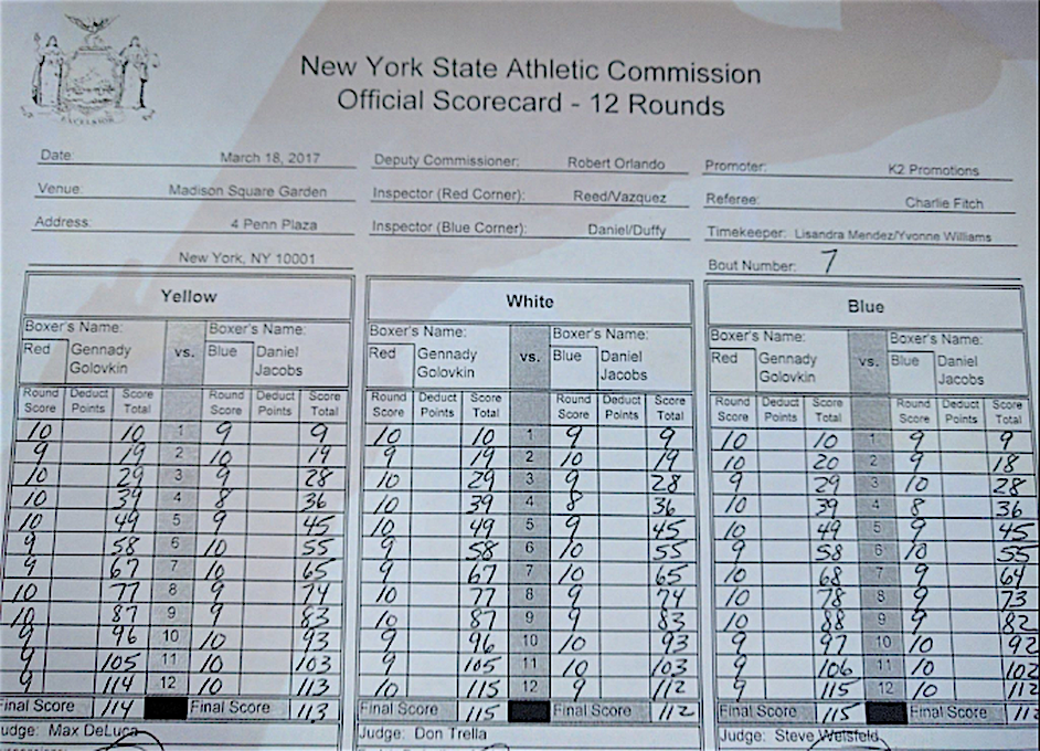 I tre giudici da sinistra a destra: Max De Luca (114-113), Don Trella (115-112), Steve Watsfeld (115-112) per Golovkin.