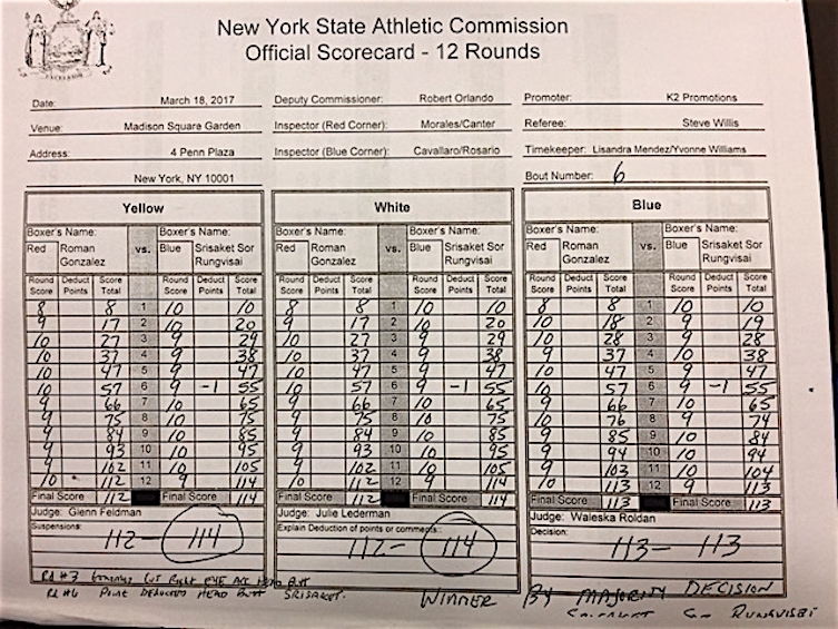 I tre giudici da sinistra a destra: Glenn Feldman (112-111), Julie Lederman (112-111), Walesta Roldan (113-113) per un verdetto in favore di Srisaket Sur Rungvisai.