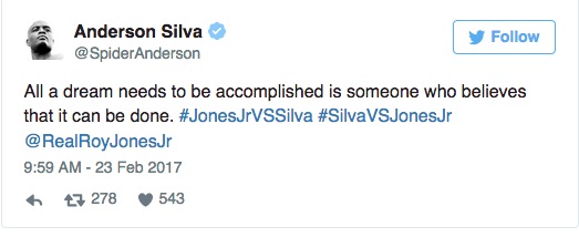 Sembra che nella serata in cui l’ex campione di pugilato e l’uomo della UFC si affronteranno, si voglia proporre anche l’incontro tra il 48enne Roy Jones jr (campione del mondo di boxe nel lontano 2003) e il 41enne Anderson Silva (0-0-1 come pugile, 34-8-0 nell’UFC)…