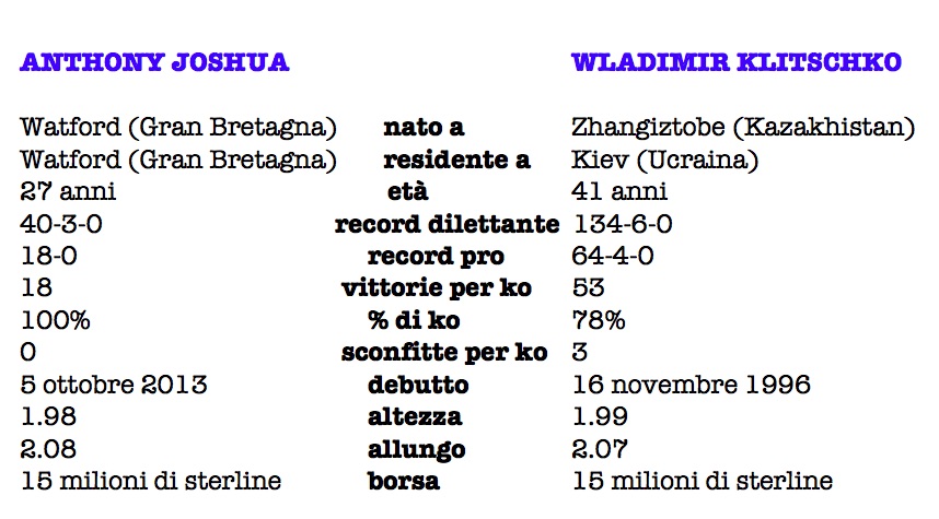 IL PROGRAMMA – Campionato massimi Ibf, Ibo (vacante), Wba (supercampione): Anthony Joshua (18-0, 18 ko, 113,4 kg) vs Wladimir Klitschko (64-4-0, 53 ko, 109 kg). Arbitro: David Fields (Usa), giudici: Don Trella (Usa), Steve Weisfeld (Usa), Nelson Vazquez (Portorico); Piuma: Scott Quigg (31-1-2) vs Viorel Simion (21-1-0); Leggeri: Luke Campbell (16-1-0) vs Darleys Perez (33-2-2); Leggeri (donne): Katie Taylor (4-0) vs Nina Meinke (5-0).