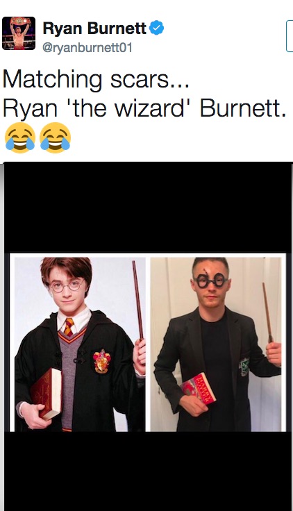 Ci ha pensato Ryan Burnett a restituirmi il sorriso. Ha postato sul profiloTwitter una foto in cui appare in tutta la sua somiglianza con Harry Potter. Fino a quando non è diventato campione del mondo non aveva un soprannome che fosse di suo gradimento, ora ha deciso: Ryan “il mago” Burnett. Mi piace.