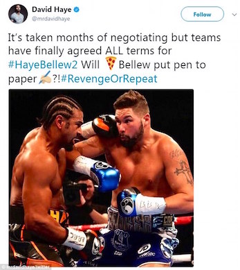 Il 17 dicembre, di domenica!, Tony Bellew (29-2-1, 19 ko) concederà la rivincita a David Haye (28-3-0, 26 ko) sul ring della 02 Arena a Londra.