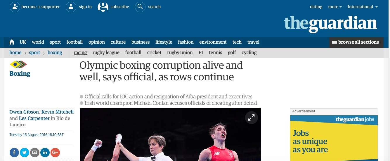 Il 15 agosto 2016 una delegazione irlandese è entrata al Villaggio Olimpico dopo la clamorosa sconfitta della Taylor. È stato in quell’occasione che il capo allenatore Zauri Antia avrebbe avvicinato il team manager per confessargli che anche l’incontro del giorno dopo tra Conlan e il russo Vladimir Nikitin sarebbe stato truccato. Aggiungendo che ormai Conlan era una causa persa, altri avevano già deciso che sarebbe rimasto fuori dal giro medaglie.