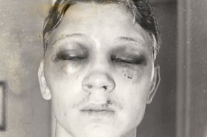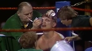 Il volto di Collins è devastato dai colpi (in alto una vecchia foto scattata per The Ring la mattina dopo il match). Ha numerosi tagli, gli occhi gonfi e pesti sono ridotti a due fessure. Il papà sale sul ring, lo consola, poi va a complimentarsi con il portoricano.