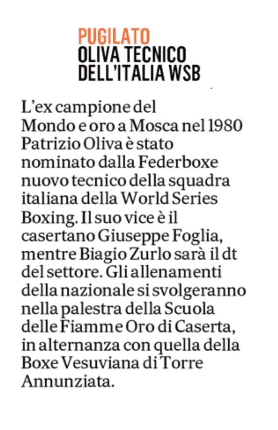 “In relazione agli articoli usciti su quotidiani nazionali ed in considerazioni della necessità di chiarire degli equivoci sorti in merito a notizie diffuse, si precisa che Patrizio Oliva, su richiesta del Direttore Tecnico della Nazionale WSB Biagio Zurlo, collaborerà alla gestione tecnica della Rappresentativa WSB, fornendo il proprio contributo derivante dalla prestigiosa esperienza fatta nei periodi di atleta e tecnico.