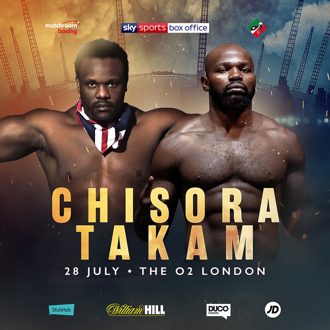 Il 28 luglio alla 02 Arena di Londra si affronteranno i pesi massimi Carlos Takam (35-4-1, 27 ko) e Derek Chisora (28-8-0, 20 ko). Il match è stato appena ufficializzato a Londra. Takam, amministrato dalla Opi Since 82 della famiglia Cherchi, torna sul ring dopo la bella prova nel mondiale contro Anthony Joshua.