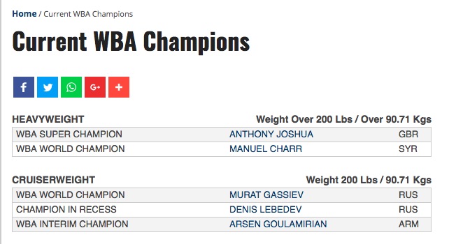 Non bastano la differenziazione in diciassette categorie di peso, la spartizione in quattro Enti diversi, considerando solo le sigle maggiori e ignorando le altre (almeno) dieci. No, ecco la World Boxing Association che ci racconta che in una sola categoria, i massimi leggeri, lei ha quattro campioni del mondo.