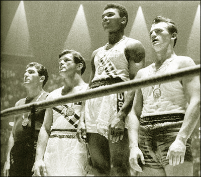 Poggiava le mani sul tappeto, si tirava su, aspettava l’8 e poi si scagliava contro Hudson. Due rapidi sinistri al mento e l’altro era finito sulle corde, per poi scivolarvi sopra ed andare giù al tappeto. Aveva gli occhi vitrei, sanguinava dal naso e dalla bocca. Ma il signor Bybel gli permetteva di ripresentarsi al centro del ring. Un diretto destro di Clay lo centrava al mento, stavolta non si reggeva proprio in piedi, le ginocchia non lo tenevano. Era kot al terzo round. Anche Bybel si arrendeva. L’uomo che gli Stati Uniti avrebbero schierato nella categoria delle 178 libbre, pesi mediomassimi al limite degli 81 chili, era Cassius Clay: 102 match all’attivo, 62 dei quali vinti prima del limite e 32 ai punti. Otto le sconfitte.
