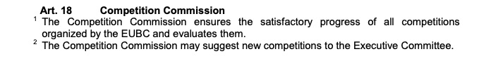 Dovrebbe allora rivolgersi alla Commissioni delle Manifestazioni che “garantisce lo svolgimento soddisfacente di tutte le competizioni organizzate da EUBC e le valuta.” (articolo 18 comma 1 del Regolamento EUBC).
