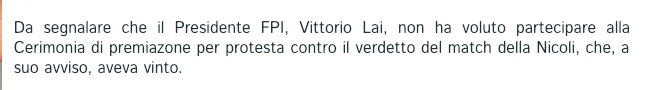 Ci informa il sito ufficiale federale: “Da segnalare che il Presidente FPI, Vittorio Lai, non ha voluto partecipare alla Cerimonia di premiazione per protesta contro il verdetto del match della Nicoli, che, a suo avviso, aveva vinto.”
