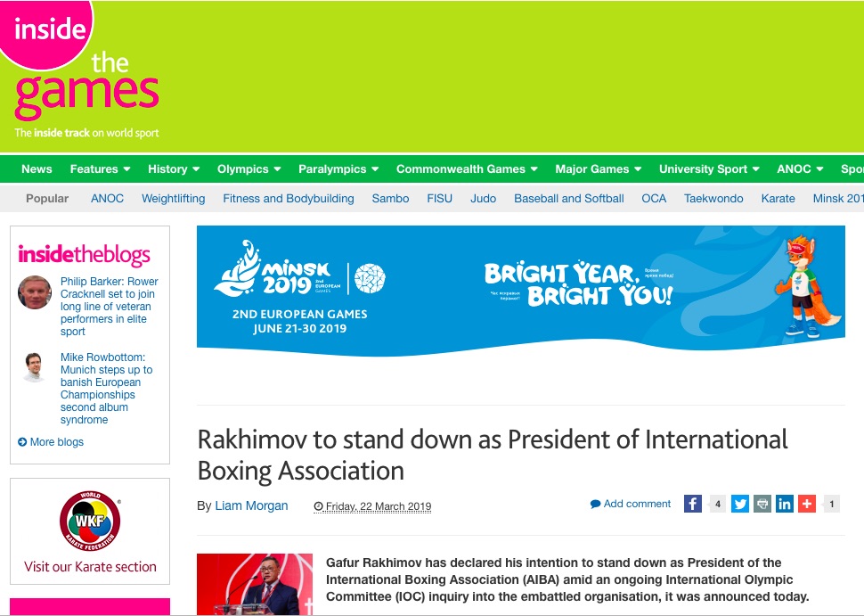 “Data la situazione attuale, ho informato il Comitato Esecutivo dell’AIBA della mia intenzione di ritirarmi dal ruolo di Presidente dell’AIBA, in conformità con lo Statuto e il Regolamento AIBA che consentono al Presidente di rinunciare all’esercizio dei suoi poteri e di essere sostituito da un presidente ad interim” ha detto Rakhimov nella dichiarazione fatta al Comitato.